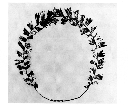 Nécropole Ouest. — Une nouvelle nécropole a été repérée au Sud du rempart Ouest (champ Sakomitrou), qui devait enclore, outre le temple d'Asklépios, un secteur d'habitat auquel elle correspondrait. Les quarante-deux tombes fouillées sont disposées par groupes et connurent deux phases d'utilisation, l'une au IVe s., l'autre au IIIe-IIe s. av. J.-C. ; de la seconde datent deux couronnes en or (fig. 3) et la réutilisation de seize stèles funéraires inscrites — toutes hellénistiques, sauf une d'époque archaïque — comme couvercles de tombes à ciste.