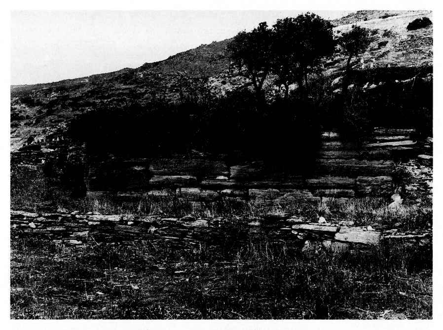 Stavropéda. — Les vestiges d'une construction carrée (25 m de côté) ont été repérés à 1 km environ au Sud de la chapelle Saint-Georges, près de laquelle on connaît l'existence d'une structure analogue (fig. 157), qui est vraisemblablement une tour hellénistique. On mentionne aussi la présence de très nombreux remplois antiques dans trois constructions en pierres sèches d'époque moderne (terrain Karamolengou-Karabetsou) ; ils doivent provenir d'un bâtiment antique naguère endommagé, dans les ruines duquel on a trouvé un bol mégarien.