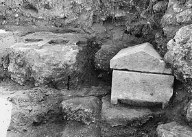 La fouille du terrain public sur la route entre Rhodes et Kallithéa (au niveau de la rue Delphon) a livré une urne-ossuaire en pierre avec son couvercle (fig. 2) : elle contenait des os brûlés et était posée sur des blocs de poros taillés. Un autre bloc de poros avec des caissons, provenant peut-être d’un petit temple, a été trouvé à proximité.