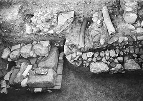 - trois phases de construction ont pu être identifiées sur l’élévation des murs des trois édifices : une phase hellénistique, une phase romaine et une phase protobyzantine. Dans la première maison, aucun mur intérieur n’a été retrouvé, mais on a repéré les vestiges d’un sol en carreaux de terre cuite qui appartient à la phase romaine tardive et dans lequel étaient placés des pithoi, ainsi qu’un puits à embouchure d’argile. Le deuxième édifice est fondé sur une couche contenant du mobilier du IVe s. av. J.-C., notamment des fragments d’amphores coennes. Les blocs de marbre appartenant à la décoration architecturale suggèrent un édifice public plutôt qu’une maison (fig. 2). Probablement à l’époque romaine tardive ou protobyzantine, lors d’un réaménagement des lieux après une destruction peut-être due à un séisme, des fosses ont été creusées : elles contenaient des fragments des enduits peints qui recouvraient les murs à l’époque romaine.