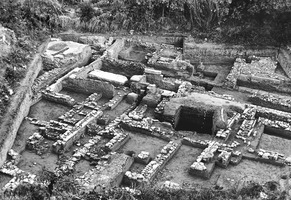 - les murs occidentaux des trois édifices correspondent à la bordure de la rue Nord-Sud, large de 4,30 m : un tronçon en avait déjà été mis au jour en 1992 dans un terrain situé plus au Nord. Elle est conservée sur une longueur de 65,80 m. Neuf niveaux de chaussées ont pu être identifiés : trois appartiennent à la période protobyzantine, trois à la période romaine et trois à la période hellénistique. – Cette rue croise une autre rue, d’une largeur de 4,20 m, dont la bordure est constituée par le mur Nord du premier édifice. La découverte de ce croisement confirme les hypothèses sur le système de voierie de la ville après le synoecisme (366 av. J.-C.).