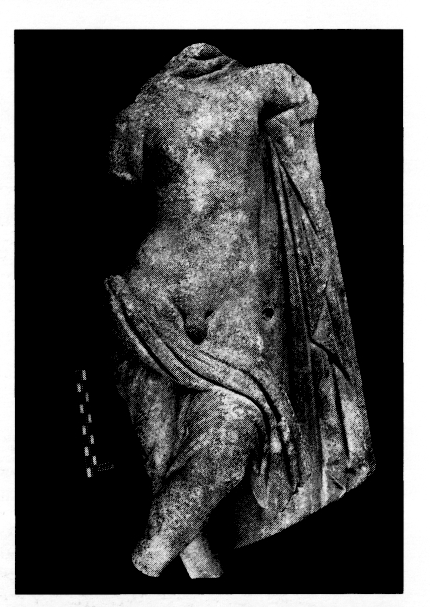 — rue Haghiou Ioannou, la suite de la couche de débris sacrificiels découverte l'année précédente (v. BCH 122 [1998] Chron., p. 940) ; on a découvert des fosses qui marquent vraisemblablement l'emplacement d'arbres et attesteraient l'existence d'un bois sacré autour de l'autel ; des trous de poteaux, sans doute destinés à l'installation de structures légères ménageant de l'ombre ; trois nouvelles constructions souterraines, vraisemblablement liées au sanctuaire et comblées à l'époque paléochrétienne avec du matériel de diverses époques, dont une statue d'Hermaphrodite (fig. 173). Parmi les trouvailles, on mentionne un manche de poignard en os du IVe-Ve s. ap. J.-C. décoré d'une figure portant une œnochoé et une phiale. De nombreuses inscriptions votives et bases de statues ont été trouvées dans les constructions et les couches environnantes.