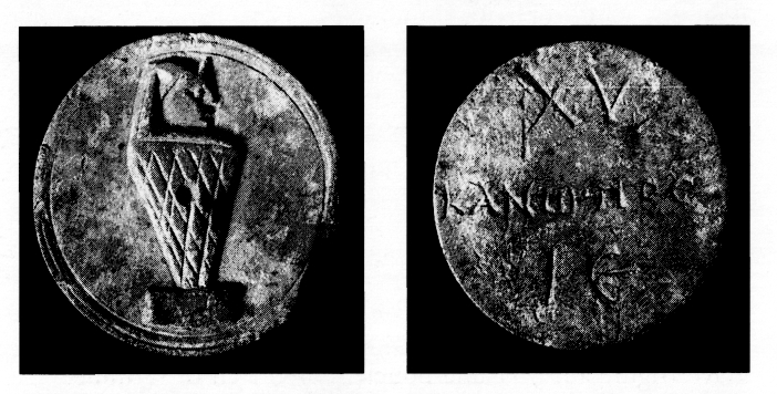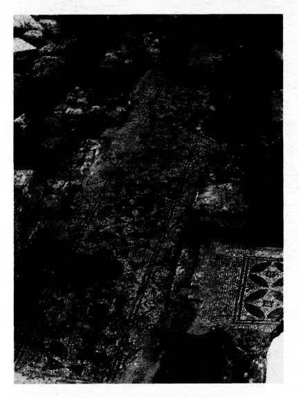 — rue Savva Pavlidi, dans la chaussée de la rue Ρ 39, une construction monumentale de plan quadrangulaire en blocs de poros et mortier, qui abrite une galerie souterraine accessible par un puits ; la structure, dont la fonction originelle reste indéterminée, fut transformée ultérieurement en collecteur des eaux de ruissellement ; la rue Ρ 39 était bordée par un luxueux bâtiment romain dont on a dégagé deux couloirs pavés de mosaïques à motifs géométriques (fig. 174) ; parmi son mobilier, on mentionne un petit disque en os (jeton ? billet de théâtre ?) inscrit sur une face et orné d'un vase canope sur l'autre (fig. 175).