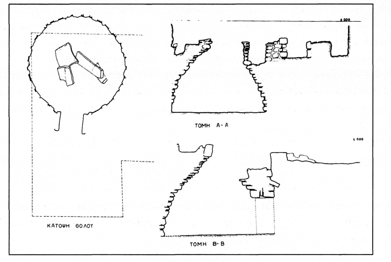 En 1993, des travaux de voirie ont amené la découverte d'une tombe à tholos géométrique (fig. 193) et d'un péribole funéraire hellénistique au Sud-Ouest du village d'Haghios Ioannis. La tholos (diam. 3,25 m ; haut. 3 m), dont la toiture fut endommagée par la construction du péribole, comportait un dromos, comblé à l'aide de pierres et de terre, et une entrée avec piédroits et linteau monolithes. À l'intérieur de la tombe, sous trois couches contenant du matériel mêlé, on a recueilli, dans la couche inférieure, de la céramique géométrique, des armes et une figurine. Le péribole hellénistique, de plan quadrangulaire, abritait deux tombes construites en poros et en briques. AD 48 (1993) [1998] B'2, p. 445 [A. Vassilakis].
