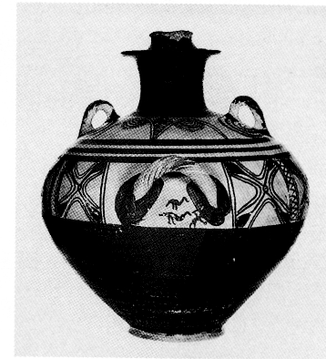 Parmi ce mobilier, que la poursuite des fouilles a encore enrichi (le nombre des vases atteint aujourd'hui 500, celui des autres objets 1 500, dont 13 sceaux) se distingue un tesson de cratère HR IIIC2 à décor figuré qui représente une scène de prothésis : le défunt est allongé sur le lit funèbre, un chien au dessous ; à droite un grand personnage qui fait un geste ou brandit un objet (prêtre ?) et un autre plus petit (femme, enfant ?) ; à gauche, deux pleureuses et une chèvre attachée à une corde.
