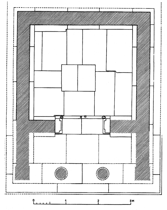 , premier fouilleur de l'édifice, selon laquelle ce bloc constituait la base de la statue cultuelle. On a aussi constaté que le dallage en poros et le seuil ne présentaient pas de traces d'usure, ce qui suggère que l'édifice ne fut pas utilisé pendant bien longtemps : il pourrait s'agir d'un trésor, donc d'un bâtiment non cultuel, et l'on comprendrait mieux ainsi pourquoi les Oropiens décidèrent de le démolir pour ériger, à partir du IIIe s. av. J.-C., des bases de statues sur les ruines du prodomos.
