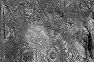 L’ensemble de l’aire fouillée est décoré de mosaïques de sol, la plupart à motifs géométriques. Seule exception, un cerf figure dans une composition qui orne la zone centrale, devant l’abside centrale Ouest. Parmi les motifs géométriques, dominent la croix et les symboles du Royaume de Salomon (nœuds de Salomon, bouclier du Roi David, fig. 1).