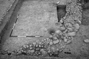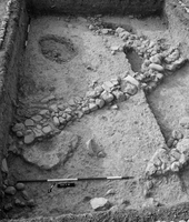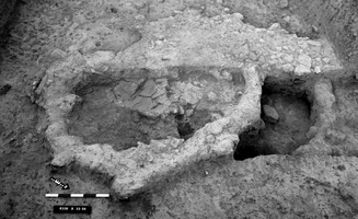 Dans la partie Nord du site, on a continué, cette année, de dégager les vestiges d’un mur qui avait été partiellement fouillé en 2007. Ce mur mesure 1,20 m de large, il a un tracé curviligne à une extrémité, rectiligne à l’autre. La fouille a révélé qu’il s’étend sur plus de 10 m de long et la poursuite de l’exploration permettra sans doute d’en déterminer la longueur totale. Les murs curvilignes sont rares à cette époque. Sa largeur exceptionnelle, de même que sa technique de construction en petit appareil indiquent en outre qu’il possédait une fonction spéciale. Le long de sa face externe, les habitants de Kissonerga avaient nivelé la surface pour créer un sol de circulation extérieur, tandis qu’une fosse circulaire, aux parois enduites d’argile, s’appuyait sur sa face interne (fig. 1). À l’intérieur de la structure se trouvaient une autre fosse aux parois enduites qui contenait un dépôt de cendres, ainsi qu’une zone où le sol avait été tassé, qui a livré une concentration de tessons céramiques et d’outils en pierre. Ce niveau illustre la dernière phase d’occupation du secteur qui soit conservée. On n’a, pour le moment, dégagé aucune subdivision à l’intérieur et la fonction du mur demeure incertaine. Il est possible qu’il s’agisse d’un mur d’enceinte, ce qui constituerait une nouvelle originalité pour un site de cette période.