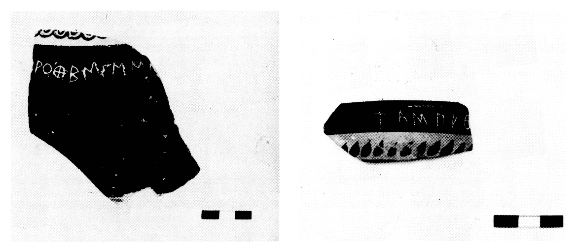 Les résultats des fouilles d'urgence déjà effectuées sur le site du métoque de Stavronikita ont été résumés dans les BCH 105 (1981), Chron., p. 831, 114 (1990), Chron., p. 790-792, et 117 (1993), Chron., p. 854. Nous en illustrons (fig. 65) quelques-uns des foyers du lieu de culte hypèthre et (fig. 66) deux tessons inscrits en alphabet corinthien : on lit sur le premier [ --- ]ρόθεμις μ'[ανέθεκε --- ], sur le second τας Πυθ[ίας] ou τας Πυθ[ονίκας]. ArchDelt 42 (1987) [1992], B'2, p. 367-368.