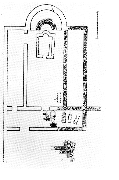 Seule la partie Sud de la basilique est conservée, une pelle mécanique ayant détruit toute la partie Nord. L'abside en fer à cheval abritait les restes d'un synthronon à degrés ; au-dessus du sanctuaire original, une petite chapelle, dont la partie orientale était accolée aux vestiges de la basilique, fut érigée très tardivement. Le sanctuaire de l'église paléochrétienne ouvrait par une porte sur la nef Nord. ArchDelt 42 (1987) [1992], B'2, p. 465-467.
