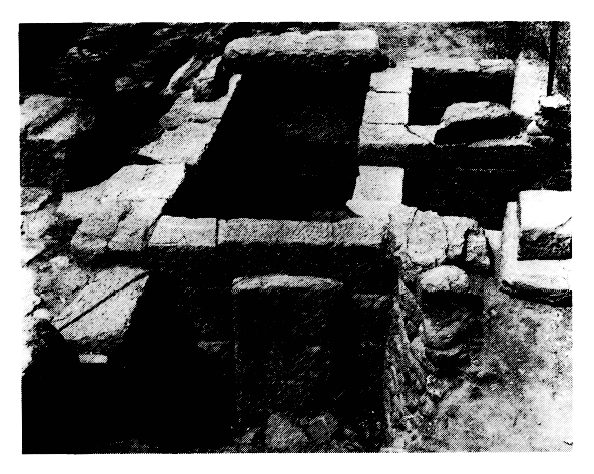 Une fouille d'urgence a mis au jour, en 1989, les fondations d'un péribole funéraire en Π, qui renfermait une tombe de type macédonien avec vestibule (3,20 x 1,40 m) et deux chambres funéraires de dimensions identiques (1,30 x 1,90 m). La tombe, conservée sur quatre assises, était construite en appareil trapézoïdal pseudo-isodome (fig. 1). Les portes des deux chambres étaient fermées par des dalles monolithes, retrouvées à terre dans le vestibule, dont la porte était aussi fermée par une dalle analogue ; des lits funéraires régnaient sur le côté Est des chambres. La tombe, qui avait été pillée, n'a guère livré que quelques monnaies de bronze (Confédération étolienne, Sicyône) et une feuille de laurier en or.