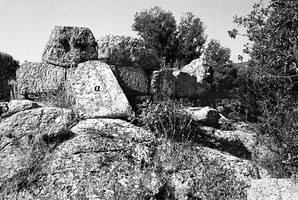 Palaiochori. On the top of a steep hill (338masl) in the northwest foothills of Mount Karvya are the remains of a round tower of small unworked stones. On the more even southeastern side of the hill are scattered sherds, and pithos and tile fragments. Wheel ruts in the rock and retaining walls indicate a cart road on the west side of the hill, leading from the northern foothills to the summit (Fig. 1).