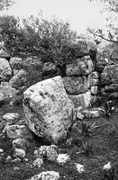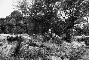 Goulas/Kastro. A fortified ancient acropolis (with scattered worked blocks, linear stone foundations, Final Neolithic to Hellenistic sherds, obsidian, etc.) occupies a plateau on top of this hill (323masl). In the middle of the east side, where the approach road ends, the pseudoisodomic wall forms a corner. A larger section of the fortification on the south side of the plateau includes a round tower with two rooms to the east and west Fig. 2). The tower is built in polygonal style of limestone blocks roughly worked on the exterior face and is flanked to the west by a long narrow room with a gate in the southeast corner (Fig. 3). The walls of this room are polygonal and pseudoisodomic. South of the tower is a probable courtyard with a cistern and an olive press. A polygonal wall defines the west side of the court (Fig. 4).