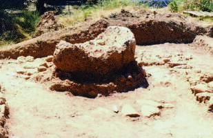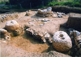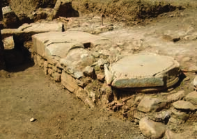 The extension of excavation to the north revealed the northern walls of the complex (in places under destruction deposits), water channels and tile floors. The monolithic trapetum was founded in a layer of unworked stones, clay and cement. To the east and west was a stone platform, to the south a wall, and to the north a platform of tile and cement probably to rest the sacks of olive pulp. The press used to extract olive oil from the pulp left after the whole olive had passed through the trapetum (fig. 1) consisted of two marble bases (one four- and one six-sided) 2.26m apart. These bases had a round cutting in the upper face (canalis rotunda) feeding into a spout which channelled the oil into two vessels set below, parts of which were preserved in situ (fig. 2). The monolithic, roughly rounded press weights were found to the south (fig. 3).