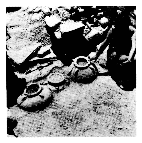 De la Maison X, utilisée du MR IA au MR IIIA2, on a dégagé les limites Nord, Est et Ouest et nettoyé trois pièces ainsi qu'une cage d'escalier dans l'angle Sud-Est. Un sondage profond dans la pièce 2 a livré un dépôt MR IA ; on y a également découvert trois pithoi MR I à demi enterrés in situ (fig. 2), et recueilli quelques sceaux en stéatite, ornés de motifs abstraits. Les fresques de la pièce 1, en cours de restauration, représentaient des lys blancs sur fond rocheux.