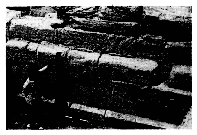 Le Bâtiment P, dégagé à ce jour sur 38,50 x 39,60 m, était constitué d'au moins six larges galeries couvertes : ouvertes et sans porte à l'Ouest, elles étaient fermées à l'Est par une façade monumentale massive — fig. 3 — , qui incorporait dans sa partie basse la façade à orthostates du Bâtiment T, nivelé lors de la construction du bâtiment MR III. Dans cette façade orientale s'ouvraient peut-être des fenêtres. La fouille de la galerie 3 a livré des pans de maçonnerie écroulés, d'où l'on conclut à une hauteur de plafond de 4 m ; l'extrémité orientale, fermée par un mur, fut réutilisée comme bâtiment au Géométrique Moyen. L'absence de murs de refend suggère que les galeries servaient de hangars à bateaux durant les mois d'hiver. Au MR IIIB, dernière phase d'utilisation, on installa dans la galerie deux fours et un foyer.