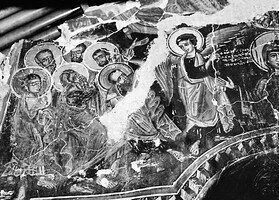 The paintings in the two churches are probably contemporary, and show similar subjects and use of colour. Three small and misspelled inscriptions offer a further connection. The cave continues west of the church, with two chambers (2m and 3.5m below the level of the church), invisible from the cave entrance, likely used to accommodate hermits.