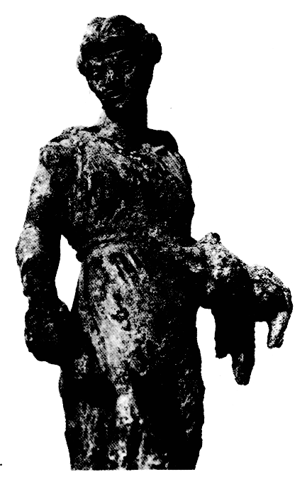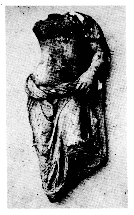 Signalons en particulier : la maison du terrain Baïkoussi (fig. 2), détruite fin IIIe - début IIe s. av. J.-C., dont les sept pièces entouraient une cour centrale (où fut trouvée la statue acéphale d'Aphrodite illustrée fig. 3) ; les deux maisons séparées par une ruelle du terrain Giorghoulas, comprenant une cuisine à foyer rectangulaire et une petite salle de bains dallée (fig. 4) ; une maison pavée d'une mosaïque en galets blancs et noirs, à décor géométrique (terrain Kondogiorghou). Quatre maisons, construites de part et d'autre du grand égout qui passe au milieu des insulae de la ville antique, datent de l'époque archaïque (terrain Lambraki) (fig. 5) ; elles présentent des traces de remaniements aux époques classique et hellénistique, contemporains de ceux de l'égout. La céramique géométrique recueillie sur le terrain atteste l'extension du comptoir corinthien jusque dans la partie Nord-Ouest d'Ambracie. Du matériel, nous illustrons fig. 6 une statuette féminine en bronze d'époque hellénistique ;