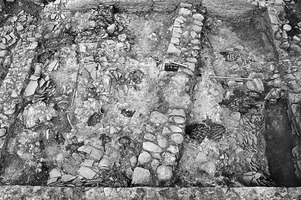Room 1 (divided into two areas) contained Laconian pan and cover tiles arranged in stacks; a thick destruction layer over it contained stone, plaster, tile, pottery and pieces of floor mosaic with geometric and floral decoration which must have fallen from an upper storey or mezzanine (Figs 2-3).