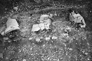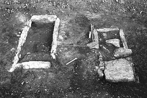 Souedias Street (parallel to I. Metaxa Street). Widening of the street caused the destruction of seven tombs (gold leaf, lamps, bronze coins, etc. were collected from the spoil): ensuing rescue excavation has to date revealed 50 Classical, Hellenistic and Roman tombs. Given the longevity of the cemetery, there is no consistent arrangement of graves, just successive levels. Most are tile graves (Fig. 2), with eight cists (six of limestone slabs and two of Corinthian tiles: Fig. 3). Reburial, common in the Hellenistic and Roman periods, is chiefly encountered in the stone cists. Classical tombs, by contrast, have one or two interments, dependent on their form. Cremation was also known on a limited scale; enchytrismoi of infants and children in amphorae or pithoi was common. At the southern edge of the plot was the burial of an animal in a tile grave, accompanied by loomweights. Finally, piles of bones at several places in the cemetery likely came from earlier burials destroyed by later tombs. The tombs contained rich goods, including gold and silver jewellery, silver and bronze coins, bone pins, and glass and pottery vessels.
