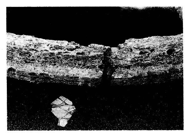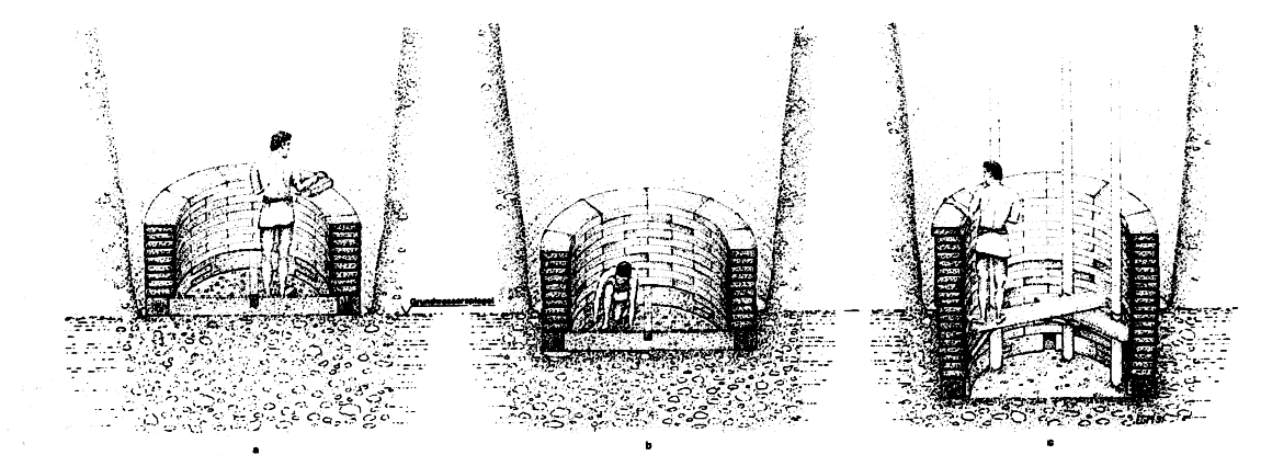 — on a achevé l'exploration des ruines au Nord du Prytanée. Un puits avait été construit à l'époque hellénistique au Nord du péristyle : le corps du puits, profond de 7,10 m, est constitué de 94 lits de briques en terre cuite maçonnées. À la base du puits, conservée sous l'eau, on a pu faire d'intéressantes remarques sur des détails techniques, qui permettent de reconstituer le processus de construction (fig. 1a-c) : le premier lit de briques repose sur un anneau de bois fait de quatre segments assemblés ; cette « fondation » en bois était installée dans la fosse destinée au puits, initialement profonde de quelques mètres seulement et encore au-dessus de la surface des eaux souterraines ; les lits inférieurs de briques étaient alors maçonnés sur l'anneau de bois (fig. 1a) ; on extrayait ensuite la terre à l'intérieur du puits, sous l'anneau de bois, si bien qu'il s'enfonçait lentement avec les lits de briques maçonnés (fig. 1b). Ce processus était répété jusqu'à ce que l'anneau de bois constituant la base du puits se trouvât à quelque 80 cm au-dessous du niveau de l'eau. La partie située au-dessus de l'eau pouvait alors être maçonnée à sec (fig. 1c). Les vases (fig. 2) et les lampes, en parfait état, recueillis au fond du puits datent son abandon peu après le milieu du Ier s. av. J.-C., après une utilisation pendant environ un siècle. Le secteur situé au pied de la pente occidentale du Kronion servait au campement et au ravitaillement, comme le confirment les abondants restes de nourriture (ossements animaux, noyaux de pêches et d'olives, pépins de raisin, coquilles de noix et de pignons) trouvés sur le sol.