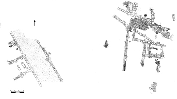 The earlier, Hellenistic, phase shows the transformation of the Classical city plan. In the east of the plot, various walls and structures included a building with at least three rooms, a structure with a hard plastered floor of undefined function and a cist grave with a tile cover containing a single inhumation without grave goods. In the west of the plot was part of a street, 5m wide and running southeast-northwest, with buildings on both sides (walls and floors were excavated, plus one mosaic floor). Pottery included late fourth to second-century BC plain and decorated wares, unguentaria, terracotta figurines, a stone altar and bronze coins (300−229 BC).