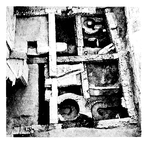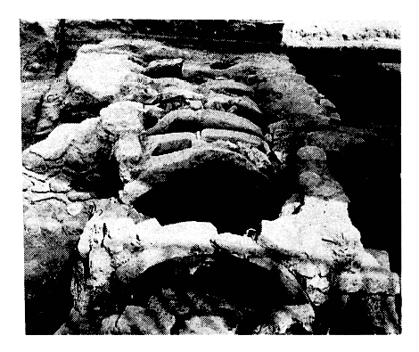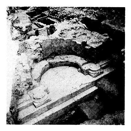 Au Nord d'une rue dallée d'époque romaine ont été dégagés les vestiges d'ateliers de production céramique (cf. ArchDelt 31 [1976], B'1, p. 91 ; 40 [1985], Β'1, p. 115-116) (rues Karaïskaki et Kalamogdarti, fig. 29). Deux des fours conservaient encore leurs piliers et leurs canaux. Le second étage d'un des deux était préservé, soutenu par une voûte à armature en terre cuite (fig. 30). Une grande quantité de vases entiers ont été récoltés à l'intérieur. Une aire de travail de préparation de l'argile était également conservée.