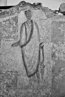 All the walls of the chamber had painted decoration, in ultramarine and red colour. The paintings were frescoes, and they were well preserved. Festoons painted in green, with seeds hanging from them were painted on each wall of the chamber. At the center of the drum of the N wall a male figure who wears a white toga was depicted (fig. 11), as well as the face of a woman in the W wall (fig. 12), and a bearded figure in the S wall (fig. 13).