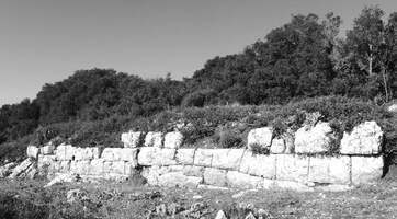 Parts of public or private buildings were excavated, built on terraces supported by retaining walls which were an adjustment to the irregular landscape of the slopes of the Acropolis. A monumental retaining wall of irregular polygonal masonry was found and exposed. It dates on the classical era (fourth century BC) (Fig. 2). The importance of this find led to the excavation of the nearest terrace, where parts of a public building possibly used for the accommodation of a garrison were exposed (Fig. 3). A well was found in the open-air space of the building. Other notable finds included coins, dated on 340-300 BCE (Fig.4a-b) and a silver Corinthian drachm of the first half of the fourth century BCE, parts of a pipe and skyphoi sherds with relief decoration from the Hellenistic destruction stratum (3rd Ct BC). (Fig. 5). Notable examples of these bear Dionysiac themes.