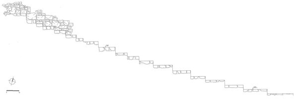 The altar Ε of the temple of Artemis Mesopolitis was cleared and examined. Τhe most important discovery being the numbered blocks, bearing inscribed letters of the Greek alphabet, a guide to construction. The letters’ style aids in the dating of the altar between the fourth and the third century BC. Inside the altar, a series of blocks adjoining the interior front of its Ε side pointed to an earlier phase (Fig. 10). The construction of the altar followed the retaining wall of the terrace of the sanctuary of Artemis which was probably built in different phases, as its lower and upper parts consist of ashlar and polygonal masonry respectively (Fig. 11).