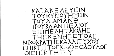 — une partie du portique protobyzantin (fig. 1) qui constituait la limite orientale de l'agora (angle des rues Prytaneiou et D. Schina). Sur le stylobate en marbre, des colonnes en marbre à fût lisse portaient des chapiteaux ioniques ; sur l'un des fûts était gravée l'inscription en neuf lignes de la fig. 2, où l'on lit les noms de l'éparque de la ville et de ceux qui avaient pris en charge la construction du bâtiment, probablement au Ve s. ap. J.-C. Le sol intérieur était constitué de plaques de marbre rectangulaires. Un prostôon s'étendait peut-être à l'Ouest ;