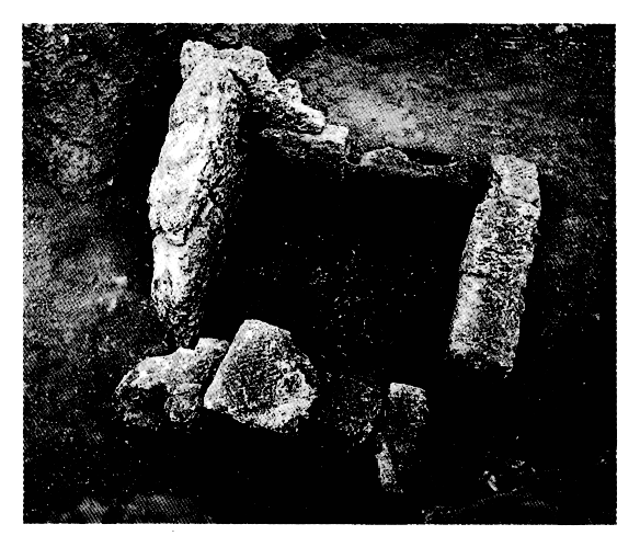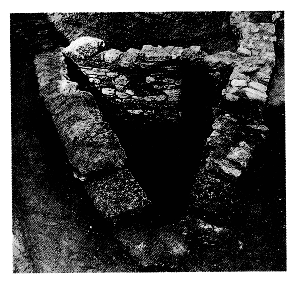 — un bâtiment d'époque classique, avec une pièce souterraine triangulaire — la première de cette forme découverte à Mégare (fig. 1) — 14 rue Rangavi : ses murs sont en petites pierres liées à la boue, et elle contenait un matériel datant du VIe au IVe s. ;