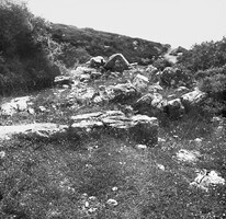 Excavation revealed a terrace and the wall which supported it, with a little tile and coarse pottery in the thin fill layers accumulated against it. Higher up the hill to the east were ancient wall foundations (Fig. 1).