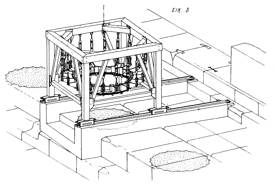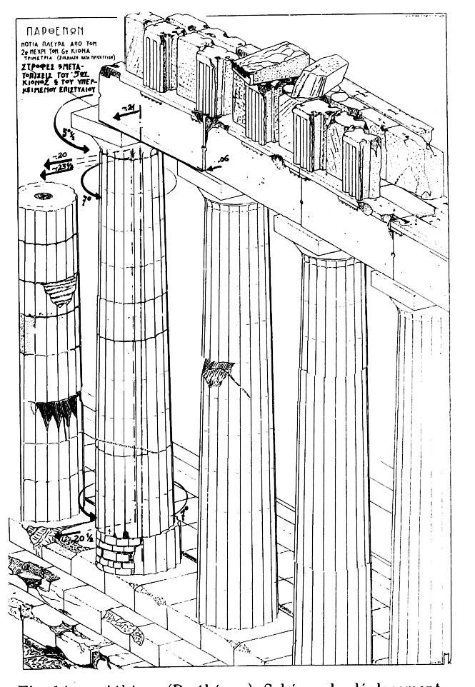 — sur le côté Sud, la 5e colonne, de 60 tonnes, a été déplacée (fév. 1992), afin d'en réparer et compléter le 1er tambour, sous la responsabilité de K. Zabas. La colonne avait été déplacée par l'explosion de 1687 et menaçait ruine, malgré la consolidation du 1er tambour postérieure à la destruction de la mosquée en 1842, puisqu'un des blocs de cet édifice y avait été réutilisé — ainsi qu'un fragment de la partie Sud de la frise. Pour le déplacement de la colonne (fig. 1), on a employé le système illustré fig. 2, capable de soulever, bouger et faire tourner une colonne entière : il a ainsi été possible de restaurer le 1er tambour sans démonter la colonne. On a ensuite remis en place son architrave restaurée, avant de tailler en 1993 les cannelures sur le marbre moderne à la manière antique ;