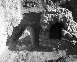 Burial no. 30: Tile-roof, containing a skull in the E end. One of the covering tiles bore an engraving of a cross inside a circle.