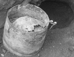 The jar-burials found were placed either next to box-shaped graves or in special trenches. Their insides contained remnants of pyre, or regular jar-burials. They were the low end of narrow-end vessels, one cylinder-shaped lead urn (fig. 4), and the base of a large glass vessel.