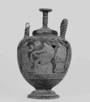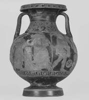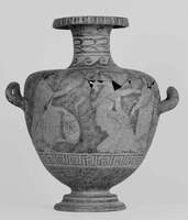 Amongst the interesting findings of this group are some red-figure vessels: a pelike (fig. 3), a marital levitas (fig. 4), and a hydria (fig. 5). The pelike depicted three youngsters wearing hymatia, and the levitas and the hydria both depicted scenes of a marital preparation. All the vessels were dated in the fourth century BC.