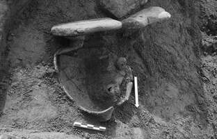 The cist graves were all empty of bones, and the grave-goods were mostly small black-painted clay vessels. Three to five of them were placed close together in each grave (fig. 6). The only exception to this type of grave-goods was a gold leaf and a female figurine, found in one of the burials. The complete absence of skeletal remains indicated that the burials were destined for infants, whose bones were dilapidated due to the soil’s pH. This theory is supported by the types of vessels found (feeding bottles, miniature vessels etc).