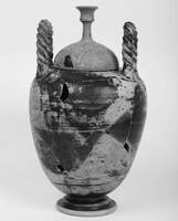 The jar-burials were placed in narrow-ended pithoi, with no consistent orientation (fig. 10). Their lid was covered with a stone slab (as was in the late Classical cemetery), and most of them contained no skeletal remains. A female burial containing silver earrings, a golden periapton, a bronze mirror, a red-figure pyxis (fig. 11) and a silver Olympia coin (c.363-323 BC) was the most luxurious one.
