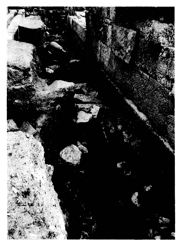 À l'extérieur du Bâtiment Y, on a pu dégager complètement la ruelle qui le sépare de la courtine de la Porte Sacrée, ainsi que la façade Nord de l'édifice. La ruelle est parcourue par un égout, installé au Ve s. av. J.-C. et où l'on distingue deux réfections à l'époque impériale (fig. 1). La canalisation venait de l'Agora, suivait la Voie Sacrée dans sa partie Sud, courait ensuite le long de la ruelle entre les Bâtiments Y et Ζ et le mur Sud de la Porte, avant d'obliquer vers le Sud pour se déverser dans une cavité sous le rempart. Cet égout se jetait probablement dans le canal de la ville. On a pu identifier la tranchée de fondation du soubassement de la Porte Sacrée, que l'on croyait jusqu'à présent cononien : certains des tessons trouvés dans la tranchée datant de la fin du IVe s. av. J.-C., la datation adoptée jusqu'ici pour le soubassement doit être modifiée.