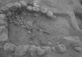 In the E part of the building, a grave was found, also dated to EHI. Human bones were found inside, perhaps of up to 30 people based on the number of skulls. Among the bones, there came to light ceramic vessels, stone beads, and a marble figurine.