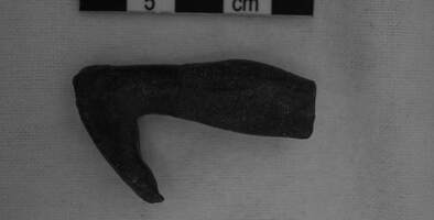 The excavation revealed that the W side’s foundations were standing onto three structures, while the statue’s base was entirely revealed. The small findings were particularly interesting, as they included (apart from pottery) handmade (without ceramic wheel) miniature vessels of various sizes, not larger than 0.03 m., an ear from an animal-shaped figurine and part of a bronze figurine that could have been a part of a runner (dromeas) (fig. 1,2). Amongst the thin pottery there were some sherds with engraved decoration, as well as some tiles, presumably from the temple’s roof. Some of the tiles still preserved red coating, while others bore the usual inscription: ΦΙΑΛΕΩΝ (engraved within a rectangular outline).