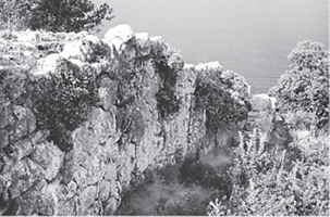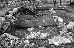 Building A (30m x 30m) is located on the south side of acropolis A. The walls are of unworked rectangular limestone blocks with no connecting material. To the south was a partly rock-cut road or passage. Excavation inside the building revealed parts of the walls of at least two rooms separated by aisles. Along the east side of the building, a stoa defines an atrium. The building’s dimensions, its location in the fortified settlement and the finds inside it (e.g. a bronze mask depicting the head of a bearded god [Fig. 2]) suggest that it was a public building (finds include three Hellenistic bronze coins). Building B was built on a rectangular terrace. (Fig. 3) The partly excavated walls delimit a wing (unit 1) of at least two rooms. The walls of unit I are also built of unworked limestone. The roof was tiled. Finds include coarse and fine pottery, loomweights, five bronze coins, iron nails, lead sheet and part of a bronze clasp.