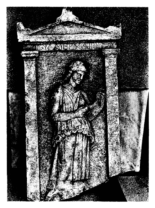 Une stèle funéraire en marbre (fig. 23), trouvée en 1982 dans la fouille du terrain E. Verdélis, en remploi comme plaque de couverture d'une tombe (cf. BCH 114 [1990], Chron., p. 732), est publiée par R. Proskynitopoulou, ArchDelt 39 (1984) [1991], Mél., p. 119-123 : il s'agit d'une stèle à fronton, représentant une jeune femme en péplos argien tenant un miroir (ou une couronne), probablement peint. La stèle, qui date de 370-360 av. J.-C, porte l'inscription Ευαμερί χαιρε, postérieure à 200 av. J.-C.
