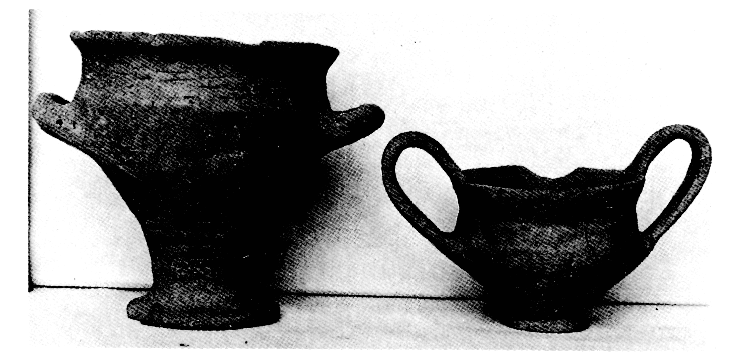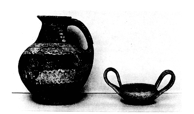 3) 160 tombes, dont 50 d'époque mésohelladique (24 cistes, 26 fosses à parois en argile), 48 d'époque hellénistique (34 tombes à tuiles, 7 tombes construites en poros, 7 crémations) et 47 d'époque romaine (28 tombes à tuiles, 13 tombes construites en brique, 6 sépultures en jarre) qui ont livré un abondant mobilier (fig. 1-8). Parmi les tombes HM, on souligne la présence d'une grande fosse de 2 x 5 m, profonde de 2 m et pourvue d'un « dromos » très incliné, avec céramique de l'extrême fin de la période (angle de la rue et de la parodos Hérakléous).