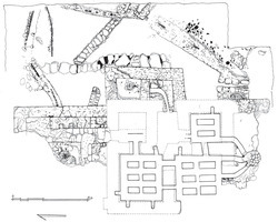 The walls of a probable apodyterion were found, with a domed roof and a stone paved floor. On the east side are built stone benches with indentations and, in the centre of the room, a marble-clad basin with supply and drainage channels. A small adjunct room leads to a further domed room which may be the tepidarium. The floor was likely paved in marble. The two next rooms, with a hypocaust system, were likely caldaria − the smaller being a private room off the main chamber. Remains of a vaulted cistern were found in the south and, below it, the main heating system with hot-air conduits leading from the furnace. Many water channels, with terracotta pipes, were found in the eastern part of the bath. Finds were mostly glazed Middle Byzantine sherds and a few Ottoman coins. A 15th-century date is suggested.