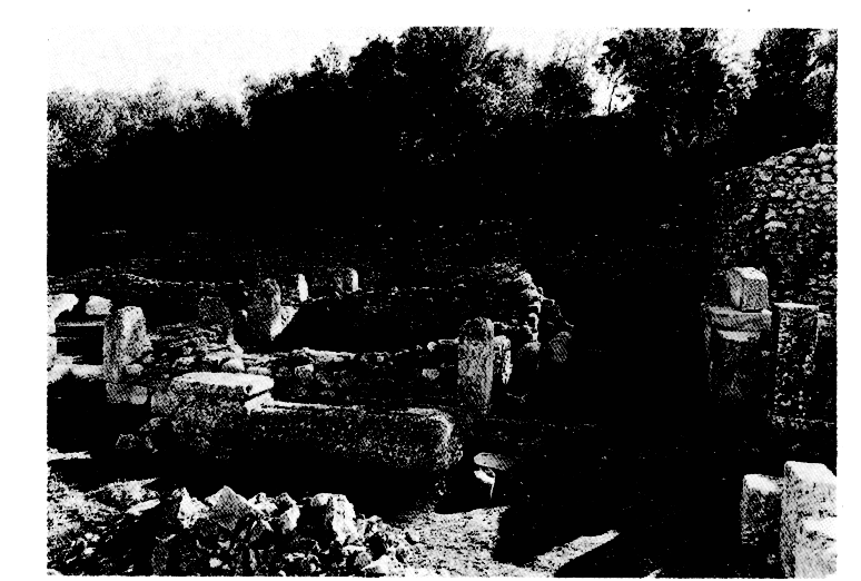 4) Travaux de restauration. — On a commencé le nettoyage et la restauration des logements romains des prêtres (fig. 2). Les espaces centraux Θ et I constituaient un important centre cultuel à la basse époque romaine, comme le prouvent plusieurs indices, en particulier une grande base qui devait supporter une aedicula à fronton monolithe et une porte monumentale. Le bâtiment a été remanié au IIIe s. ap. J.-C. On a également travaillé dans la zone du nymphée et de l'habitat préhistorique, ainsi que sur le péribole romain. On a ainsi dégagé un tronçon d'un péribole en poros plus ancien, en appareil isodome (probablement celui qui se trouve au Sud du temple classique).