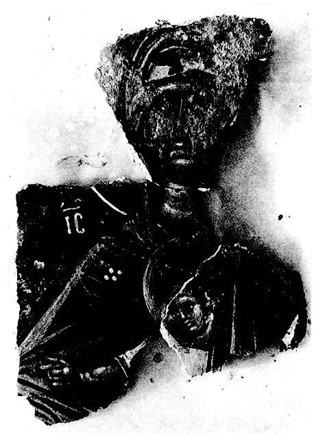 Au monastère de Pantanassa, P.L. Vokotopoulos a achevé en 1990 la fouille de la stoa Ouest. Dans sa partie Ouest, une banquette de pierre, haute de 0,40 m, supportait probablement des colonnes ou des piliers. La stoa était divisée en deux par une colonnade centrale ; sa couverture était en voûte d'arêtes à nervures, dont trois autres ont été retrouvées. Aucun élément céramoplastique n'ayant été découvert en 1990, il semble que la partie occidentale de l'édifice n'avait pas de décor de ce type. Parmi les trouvailles, nous illustrons (fig. 45) un fragment de fresque figurant la Vierge à l'Enfant.