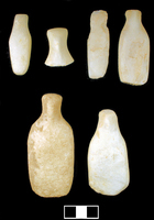 Finds characteristic of the Special Deposit South (e.g., broken marble figurines or the multiple-headed lamps found in fragmentary form at Kavos) are not found on Dhaskalio, although Dhaskalio has produced a high proportion of imported materials. Study of several categories of object (pottery, stone spools and marble bowls, vessels and figurines) confirms that, with few exceptions, breakage did not occur locally, but fragmentary material was brought here for dedication. Study of the typology of the marble figurines continues. No examples of the types common in Early Cycladic cemeteries have been found at the Dhaskalio settlement, despite their abundance in the Special Deposit South. However, the 11 schematic figurines found on Dhaskalio include examples of a type now designated the Dhaskalio sub-variety (Fig. 1). Most belong to settlement phase C, when the Early Cycladic cemeteries had gone out of use, although the Special Deposit South continued.
