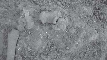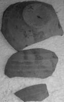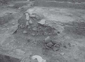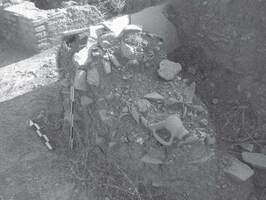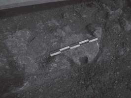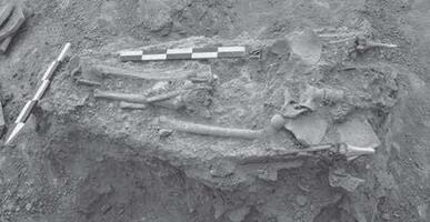 In section H, a roof-tile tomb from later antiquity was found. Traces of fire were located around and inside the burial (Fig. 10). The upper part of the skeleton was destroyed (Fig. 11). Samples of coal were collected from around and inside an amphora (Fig. 12). The layers identified were dated in the third and the fourth century BC. The findings were dated in those periods (base of black-glazed skyphos dated in the fourth century BC, metal nail etc.) (Figs. 13 - 14). It was noteworthy that the bones from the right leg were not placed in the correct anatomical position (Fig. 15).